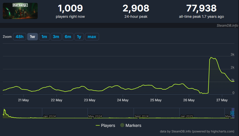 Om vi börjar med den nya heisten, hur togs den emot? Som alltid när det kommer nytt innehåll steg CCU (dvs samtida användare), denna gång till 2 900 (på Steam) som högst i samband med släppet igår. Detta är den högsta nivån på över sex månader men lägre än tidigare DLC-släpp under föregående år (t.ex. hade Houston Breakout en CCU peak på 4 700). I absoluta tal är det fortfarande låga siffror vi talar om.