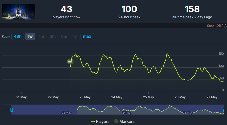 Av att döma från CCU datan i samband med/efter Out of Sight releasen så är känslan just nu att det inte direkt blev någon Roboquest-succé, vilken hade peak CCU om 4 800 vid spelsläppet, att jämföra med 158 som Out of Sight visade på Steam. Det bör tilläggas att spelet även släpptes på Epic Games Store, Playstation och XBOX Series, varför alltför stora växlar nog inte ska dras av Steam-datan. I den positiva vågskålen har vi dock betyget på Steam, vilken var höga 88%.
